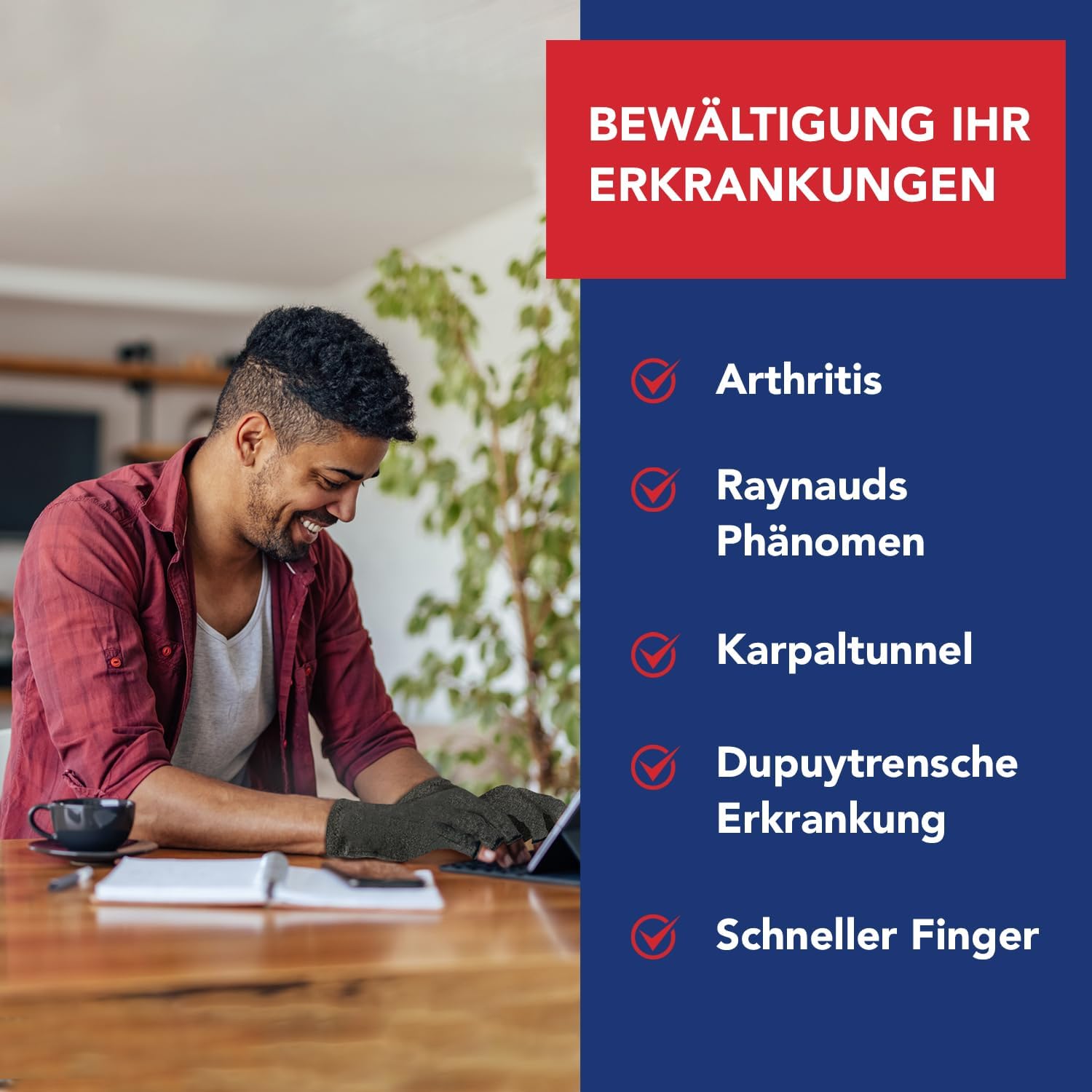 VitalKompass - Thera-Kompression™ Handschuhe aktiviert die Durchblutung, reduziert Entzündungen und löst Steifheit, sodass Finger wieder frei beweglich werden. Gleichzeitig schützt die gezielte Kompression Ihre Gelenke vor weiterer Abnutzung und unterstützt die Regeneration. Dank des weichen, atmungsaktiven Bambusmaterials mit offenen Fingerspitzen bleibt der Tragekomfort den ganzen Tag – ob bei der Arbeit, im Haushalt oder nachts im Schlaf.